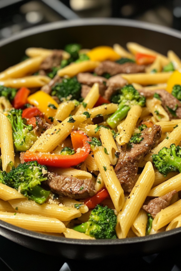 Creamy Garlic Parmesan Penne with Steak, Broccoli & Bell Peppers Recipe