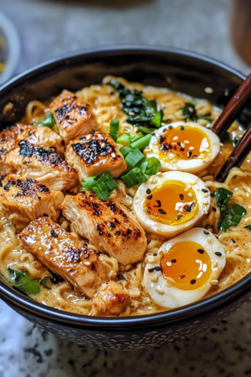 Fiery Chicken Ramen with Creamy Garlic Sauce